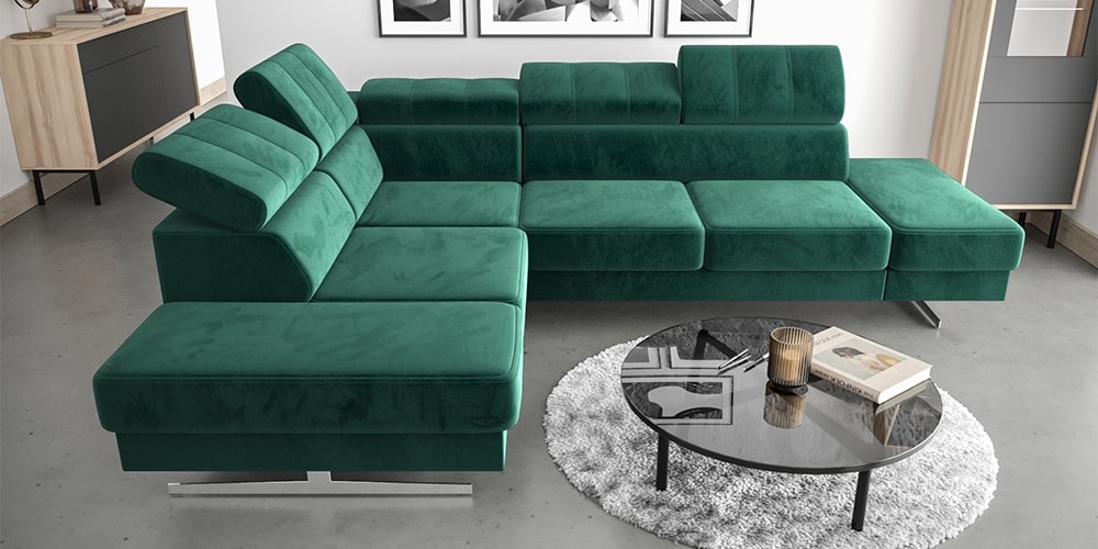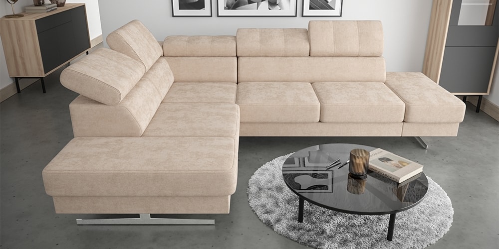 Emporio olasz sarok ülőgarnitúra, L alakú sarokgarnitúra, sarokkanapé, a legjobb minőségű alkatrészekből készült, modern dizájn, króm lábakkal, állítható fejtámlákkal, választható szövettel vagy natúr bőrrel több féle színben, jobb vagy ball sarok kivitelben. Méretek: L=300x225 cm, mélység=100 cm, magasság=79/98 cm