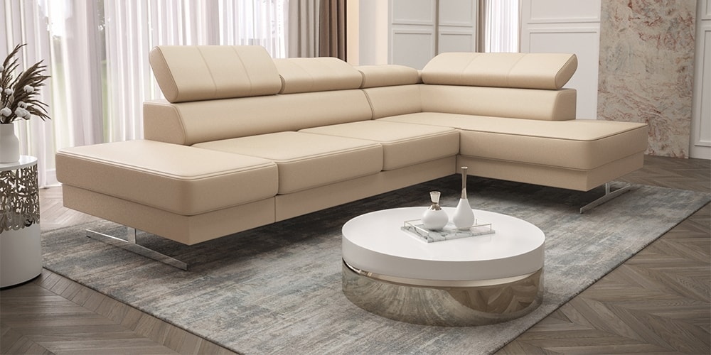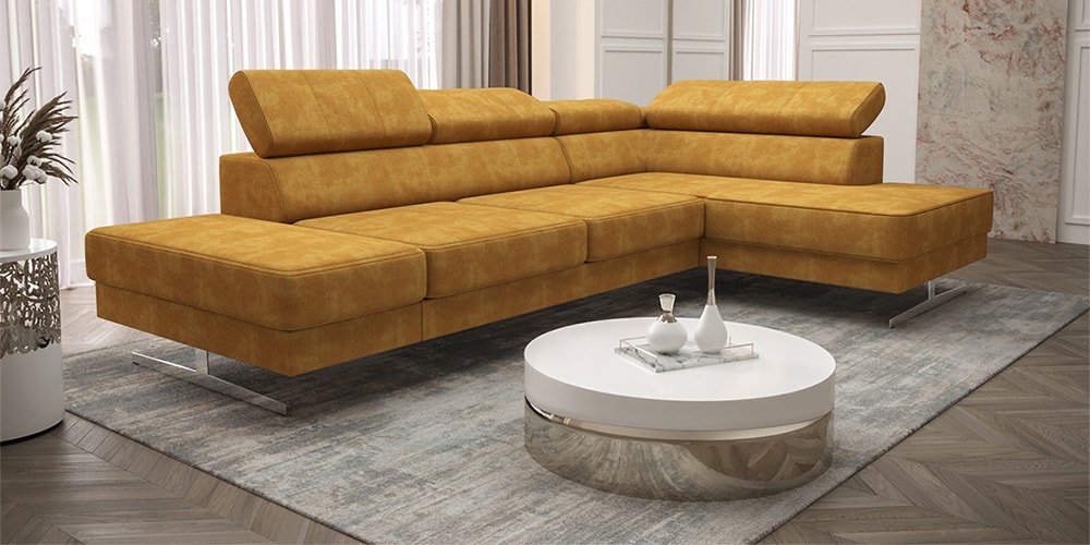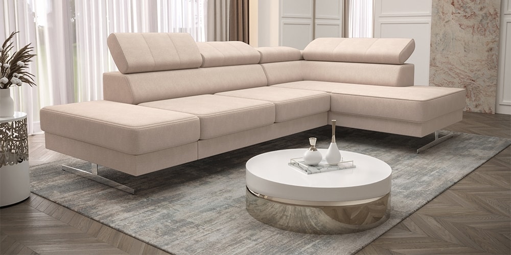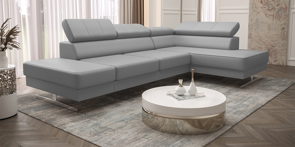 Emporio Mini szövet vagy bőr sarokkanapé, stílusos, kényelmes és funkcionális sarok ülőgarnitúra, a legjobb minőségű alkatrészekből készült, modern dizájn, magas króm lábakkal, állítható fejtámlákkal, választható szövettel vagy bőrrel több féle színben. Egyszerű és kényelmes. Méretek: L=300x185 cm, mélység=100 cm, magasság=79/98 cm