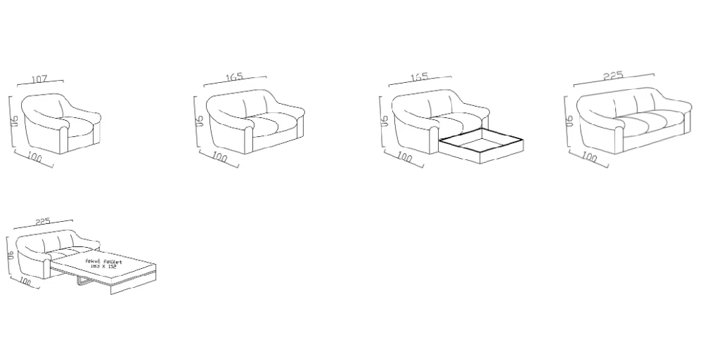 225x90x100 cm, fekvőfelület: 183x152 cm |