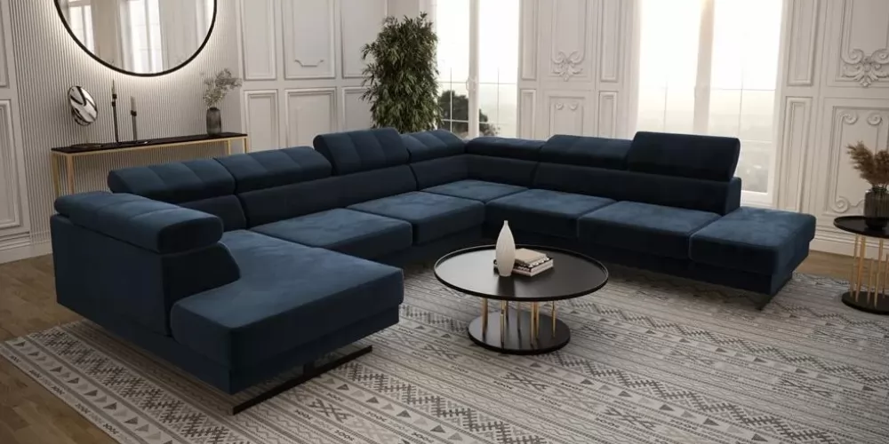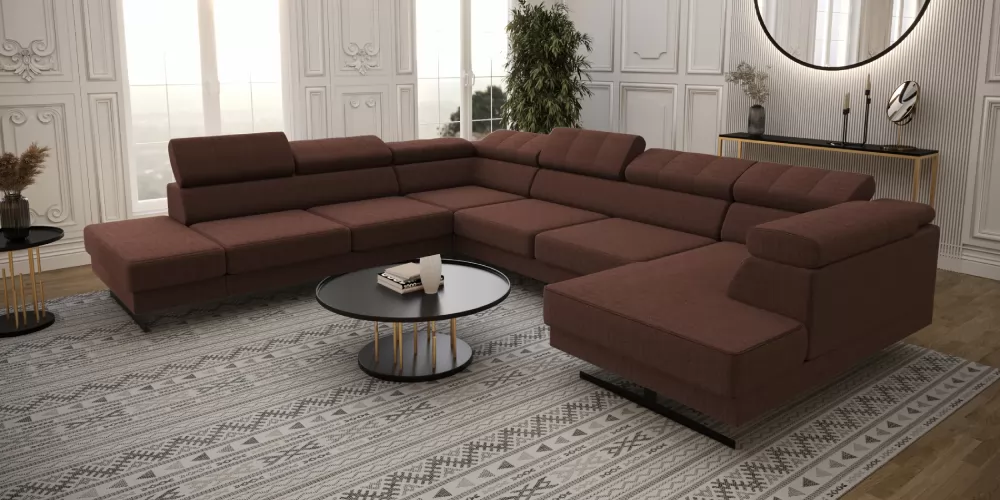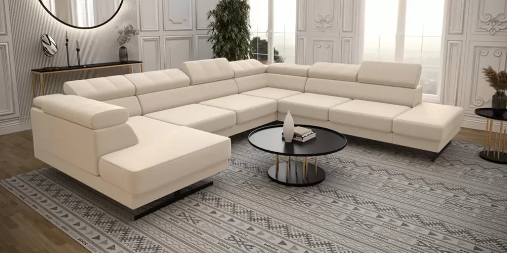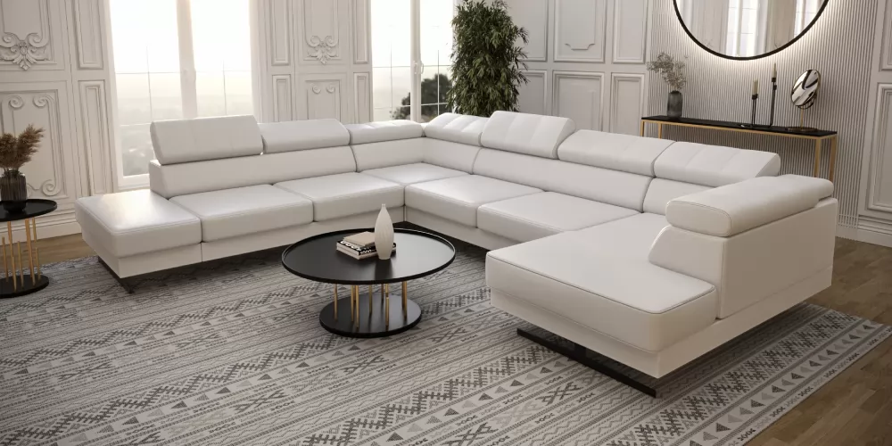 Emporio Max II. U alakú sarokgarnitúra, magas lábakon álló kanapé. Állítható fejtámla, mely lehetővé teszi a fejtámla egyéni beállítását. A tizenhat centiméter magas díszes lábak egyedi eleganciát és lazaságot kölcsönöznek. Két színben kapható: ezüst vagy fekete. Kanapé mérete: 300x350x180 cm. Választható szövettel vagy natúr bőrrel több féle színben, jobbos vagy balos sarok kivitelben.